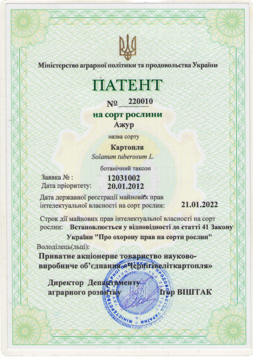 АЖУР – середньоранній сорт картоплі столового призначення. Кулінарний тип CD. Дата державної реєстрації майнових прав інтелектуальної власності на сорт рослин:21.01.2022